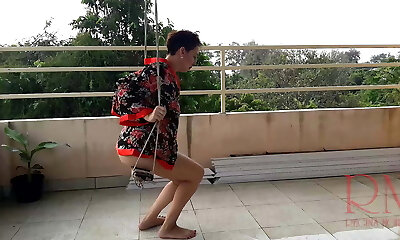 Cute housewife has fun without panties on the swing Slut swings and shows her brilliant pussy 1
