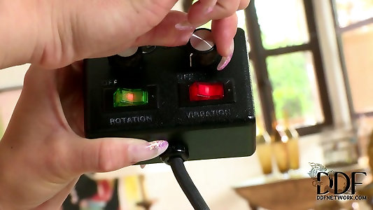 Jaw-dropping platinum-blonde seductress rides the Sybian machine